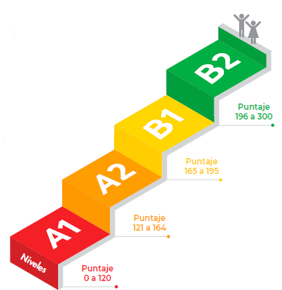 Los niveles de desempeño son una descripción cualitativa de las habilidades y conocimientos que se estima ha desarrollado el evaluado, y tienen el objetivo de complementar el puntaje numérico obtenido. El Módulo Inglés está alineada con el Marco Común Europeo de Referencia para las lenguas (MCER), los evaluados se clasifican en 4 niveles de desempeño: A1, A2, B1 y B2.