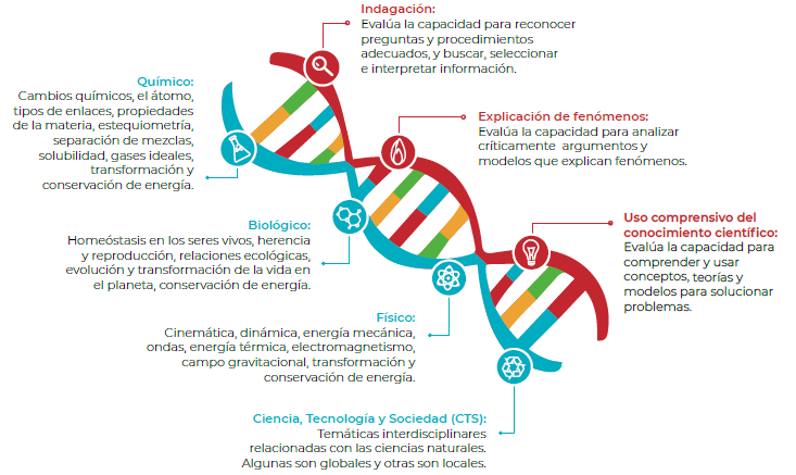 La prueba de Ciencias Naturales evalúa la capacidad del estudiante para comprender y usar nociones, conceptos y teorías de las ciencias naturales en la solución de problemas, valorando de manera crítica el conocimiento y sus consecuencias en la sociedad y en el ambiente. Las preguntas de esta prueba evalúan 3 competencias, a través de 4 componentes.